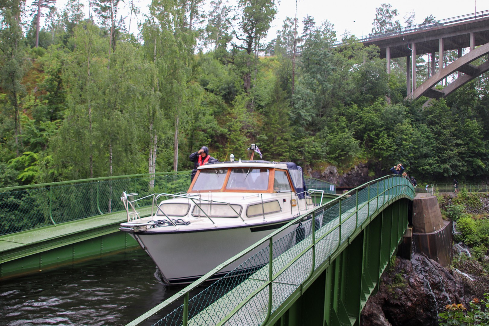 Dalslands kanal, som stod klar 1868, sägs vara en av världens vackraste vattenled, med 31 slussar i kanaler och sjösystem, som når till sydvästra Värmland och in i Norge. Kanalen har i Håverud fyra slussar där vattenleden går ÖVER forsen som då ansågs omöjlig att gå förbi som kanal. Den legendariska ingenjören Nils Ericson gick utanför boxen och tänkte bro, när kanalen skulle byggas. En akvedukt blev det, med den tidens moderna material av stål. Akvedukten sattes ihop med 33 000 nitar. En knäpp idé som sågades av tidens duktiga förståsigpåare. Med Nils Ericsons pondus och respekt genomfördes bygget, trots allt. Vem fick rätt? Jo, Nisse. En promenad över akvedukten går bra än idag och inte en enda nit har bytts ut. Den är fortfarande i original och båtarna seglar fortfarande fint på den. Över kanalen går i ett unikt virrvarr också en vägbro och en tågbro med klaff, som för stunden stod öppen för båttrafiken. Jag hade hört talas om att man skulle kunna åka dressin på tågspår i Dalsland. Jag sneglade oroligt och återkommande på den öppna tågbron för att se om det var sant.