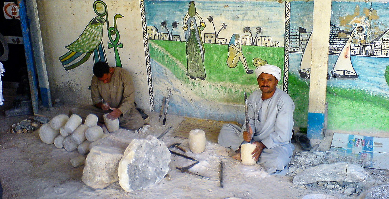 Utflykter, förresten. Den ena var en snorklingstur runt korallrev och färgglada fiskar. Den andra till Luxor, 30 mil genom öknen inklusive båtfärd över Nilen, Konungarnas dal, Karnaktemplet, Memnon-kolloserna och säkert par saker till. Bara bussresan genom Saharaöknen var ett äventyr. Man hade samlat ihop alla bussar som skulle till Luxor vid en uppsamlingsplats intill Röda havet, sedan åkte 52 bussar i karavan hela vägen med polis och militär escort. ALLA sidovägar var avspärrade av beväpnade styrkor efter vägen. ALLA bussarna var tvungna att stanna samtidigt halvvägs vid någon form av Egyptisk-öken-rasta-restaurang. Här påmindes man av magsjukevarningarna och på toa med hål i golvet rörde man ingenting. Allt spritades och sanerades när man kom ut. Sedan stod 52 bussar startklara igen och väntade på att polischefen skulle dricka färdigt sitt te, och vi kunde åka igen. Terroristangrepp var inget att oroa sig för. Säkerheten var kunglig.