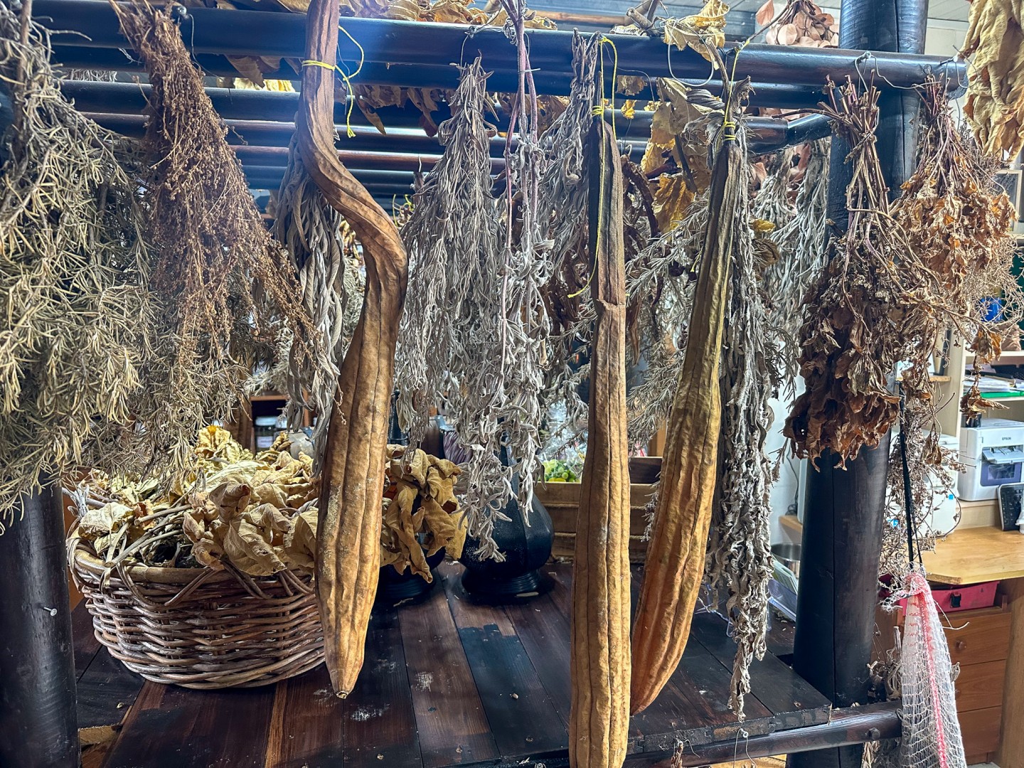 Där började en tre timmar lång resa i hans botaniska trädgård och Michalis pratar nära nog oavbrutet hela tiden. Till att börja med leds vi in i ett rum med dofter av torkade örter och aromatiska växter. Där tas också en inträdesavgift ut på 10 €/person. Vi fick en flaska vatten i handen och leddes till en veranda, likt en uteservering med bord och sittplatser. Uteplatsen kan beskrivas som en jätte-balkong på berget med utsikt över Mavrokolymposdalen och sjöutsikt. Sjön är egentligen en damm som vattenreservoar och bakom den ses Medelhavet. Michalis är en oförskämt pigg pensionär som har skapat, planterat och byggt stället själv. Han säger att han lever sin dröm här och nu med sin fru Maria.