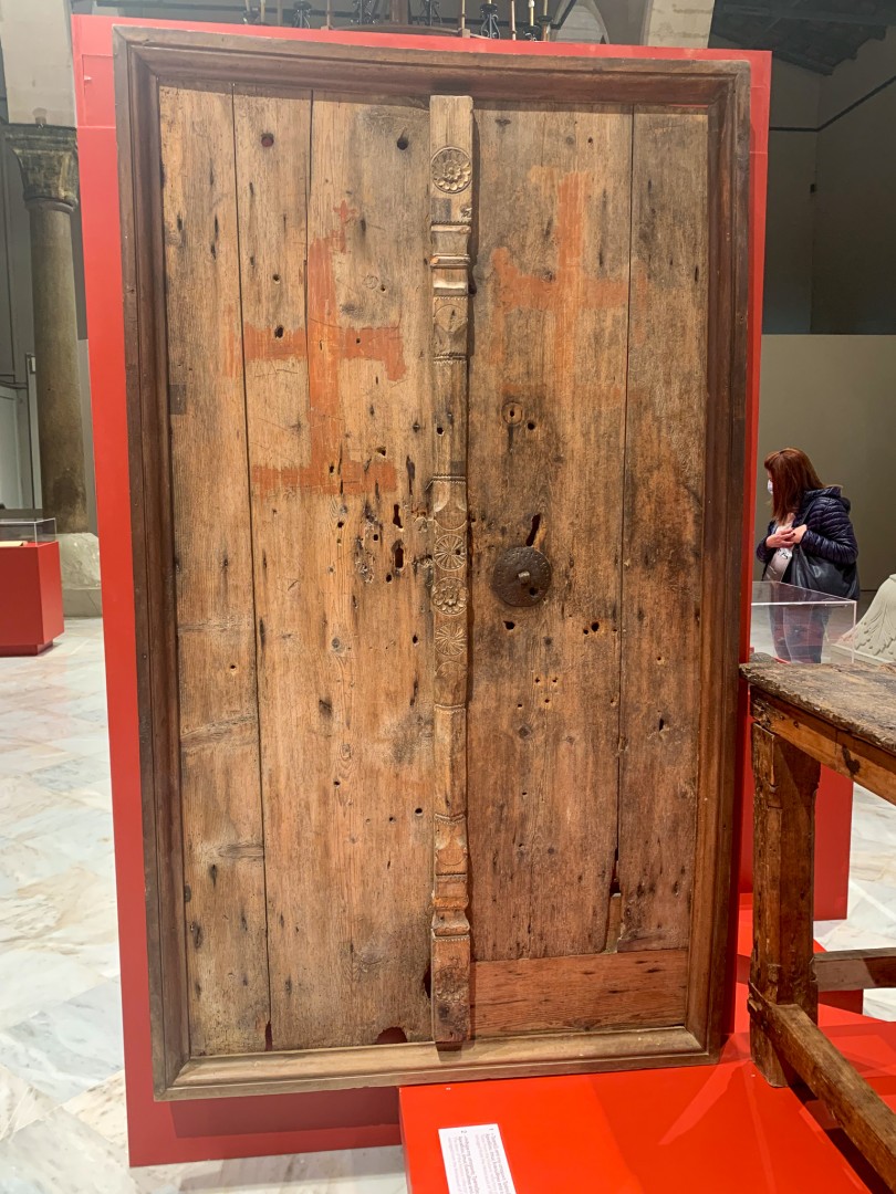 Basilikan San Markos var vi också nyfikna på, eller Basilica Agio Markou på grekiska. De medeltida venetianska hertigarnas kyrka mitt i stan är numera ett konstgalleri med tillfälliga utställningar. Vi var där för två veckor sedan och vi visste att de bytt utställning och var nyfikna på vad de nu hittat på. Den gamla kyrkan är fin i sig att besöka och den nya utställningen handlade om revolutionen 1821. Passande nog eftersom de firar den med 200 år på nacken. De hade lånat in det långa bordet och en dörr i original från Arkadiklostret. Dörren med skotthål och svärdshugg bevisade mer än att man byggde riktiga dörrar förr. Bordet med spår av svärdshugg och vilda strider i klostret. Jag har sett bordet tidigare på sin plats i Arkadiklostret som också är väl värt ett besök och även där får man ett perspektiv på den grymma och blodiga revolten mot det turkiska styret.